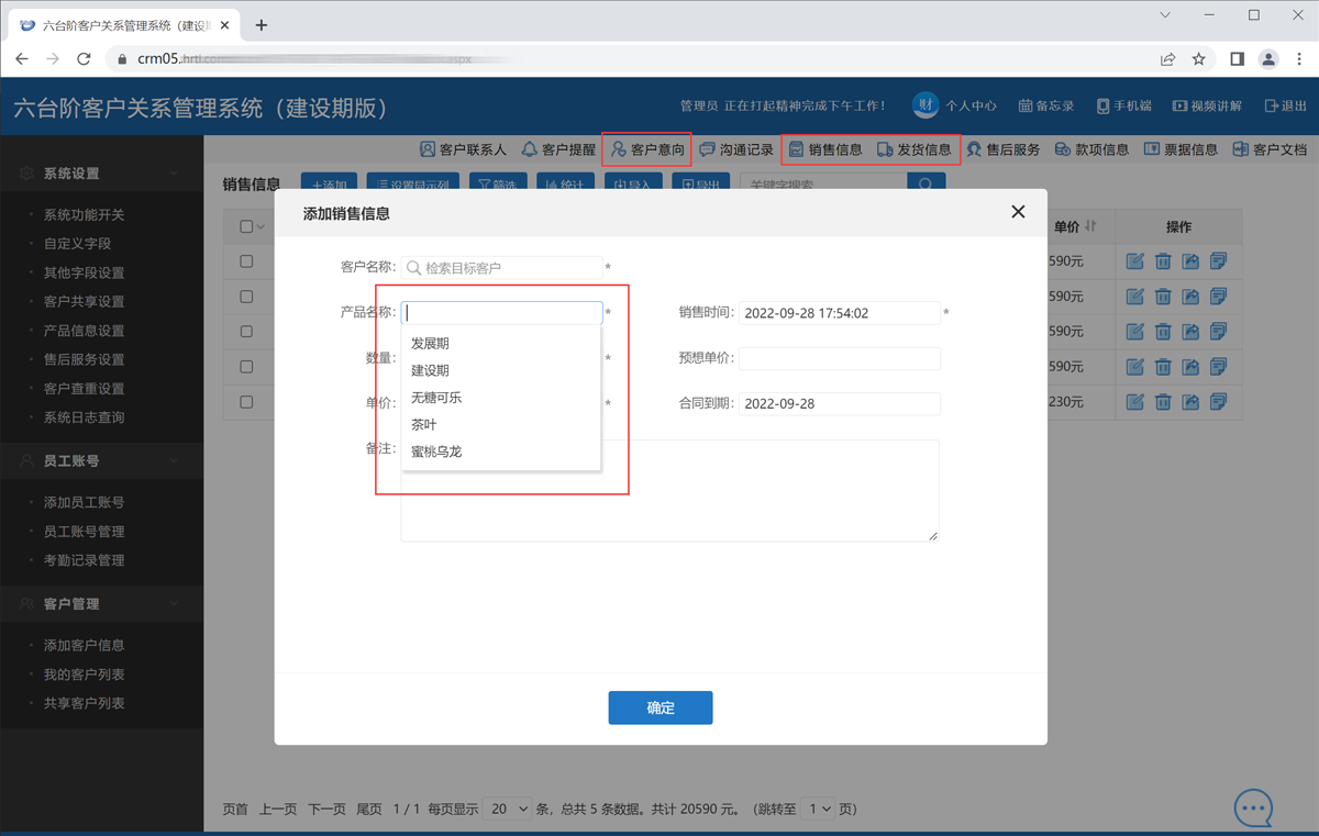 以新建销售信息举例,在录入销售信息的时候,产品名称旁边有 选择 按钮,点击后会出现管理员提前录入好的产品信息,选择需要的产品,会直接在新建页面将产品名称和产品金额输入好,当然员工也可以直接录入管理员没有录入的产品信息。